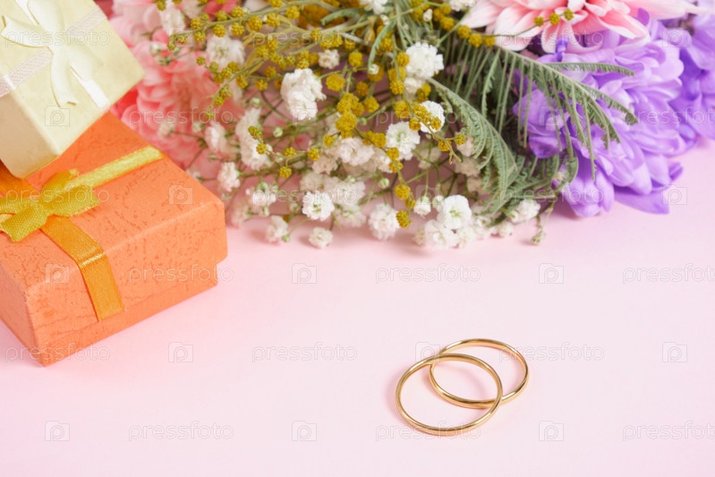 Обручальные кольца подарочные коробки и цветы на розовом фоне копией пространства