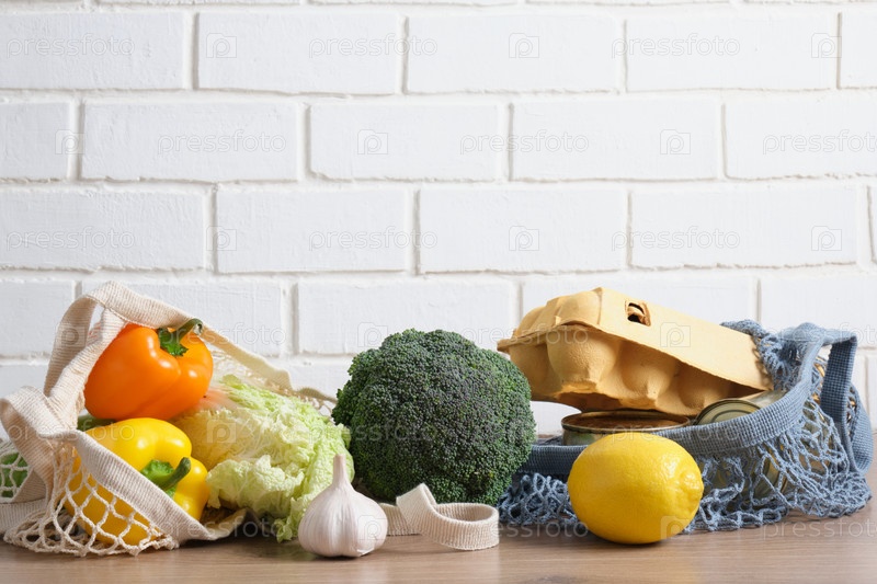 Эко-сумка с продуктами питания на деревянном кухонном столе