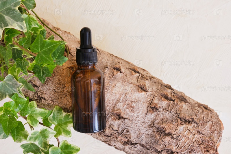 Янтарная стеклянная бутылка с сывороткой или маслом для лица на коре дерева на бежевом фоне. концепция натуральной косметики