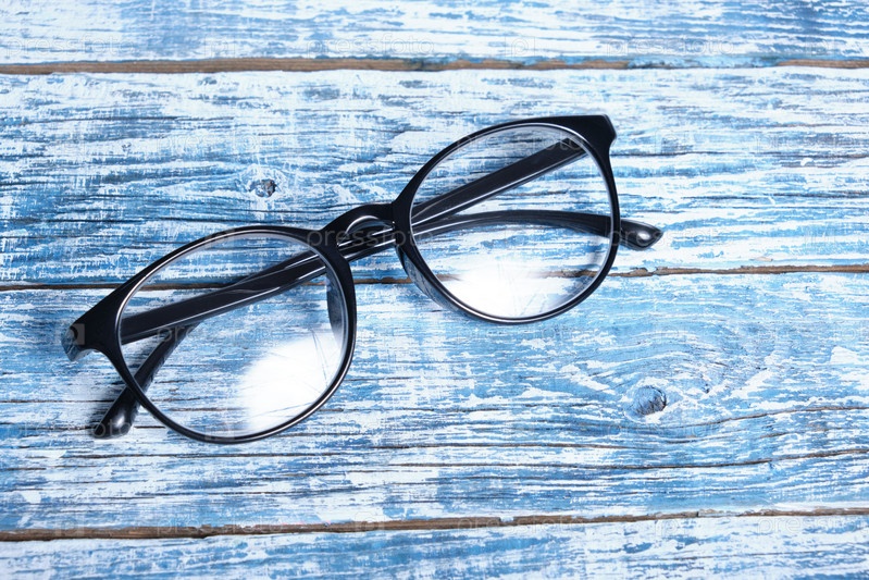 Очки в черной оправе на синем деревянном фоне