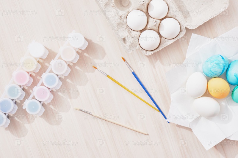Процесс росписи яиц на пасху, коробка для яиц, пасхальные яйца, тарелка, кисти и краски на столе