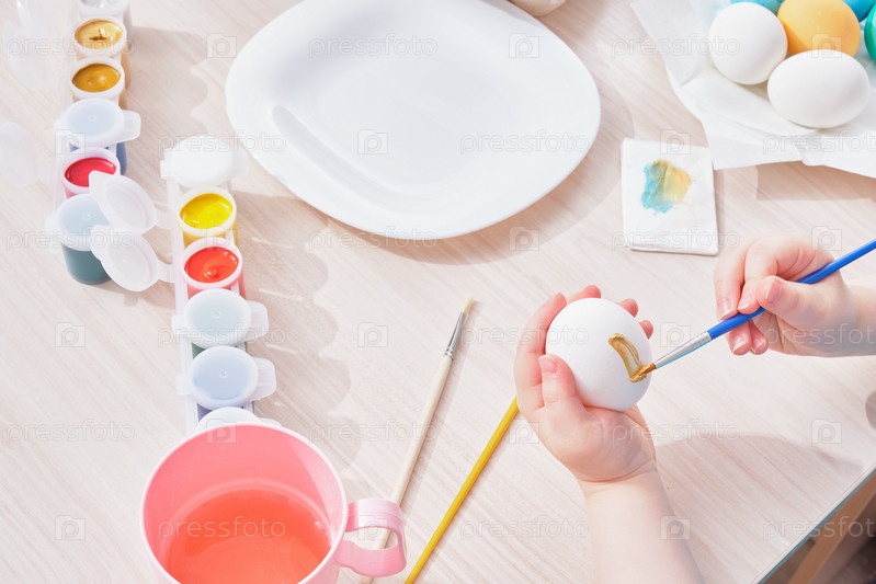 Ребенок красит яйцо на Пасху на деревянном столе,