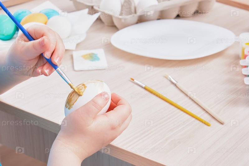 Ребенок красит яйцо на Пасху на деревянном столе,