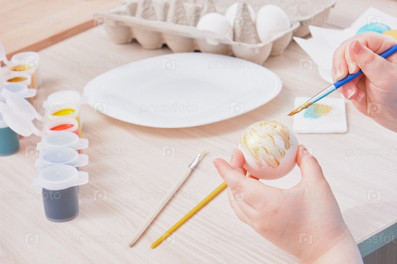 Ребенок красит яйцо на Пасху на деревянном столе,