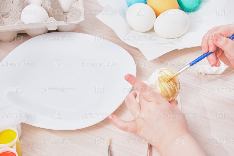 Ребенок красит яйцо на Пасху на деревянном столе,