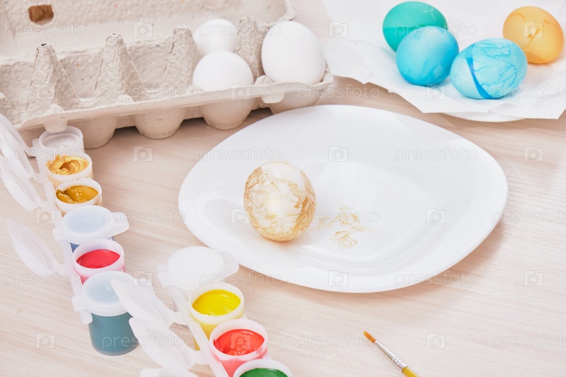 Процесс росписи яиц на пасху, коробка для яиц, пасхальные яйца, тарелка, кисти и краски на столе