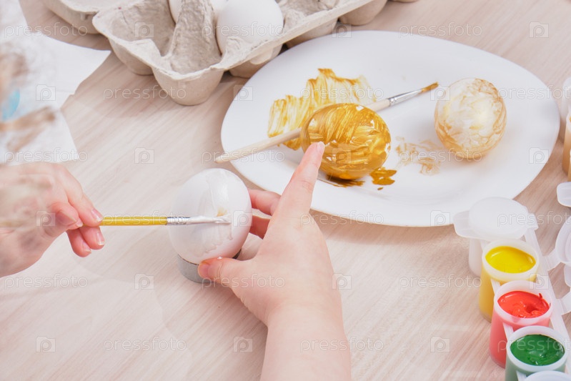 Ребенок красит яйцо на Пасху на деревянном столе,