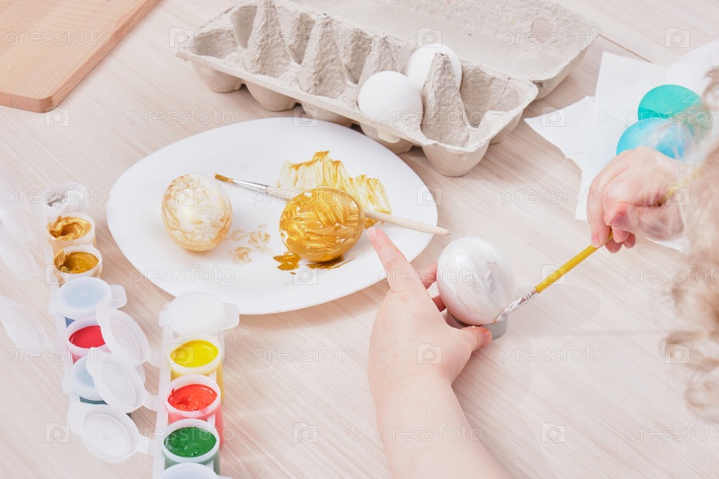 Ребенок красит яйцо на Пасху на деревянном столе,