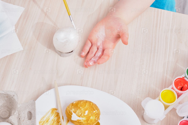 Ребенок красит яйцо на Пасху на деревянном столе,