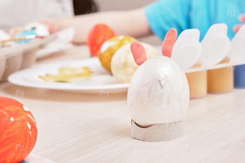 Процесс росписи яиц на пасху, коробка для яиц, пасхальные яйца, тарелка, кисти и краски на столе