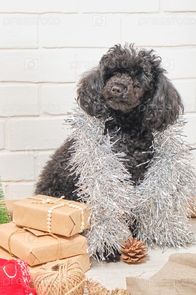 Маленький щенок пуделя с новогодними подарками на фоне стены из белого кирпича