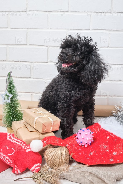 Маленький черный щенок пуделя с новогодними подарками