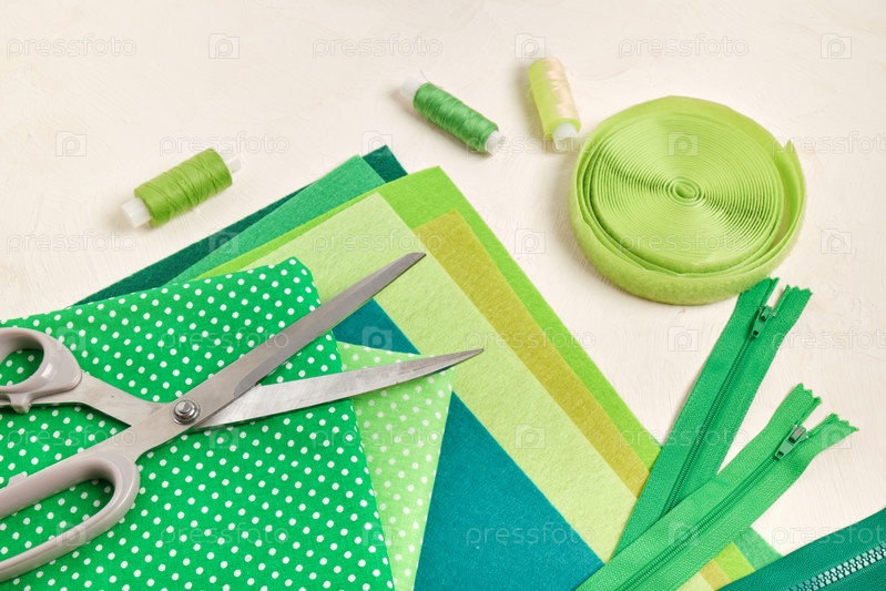 Фетр, принадлежности для шитья и рукоделия на столе, оттенки зеленого