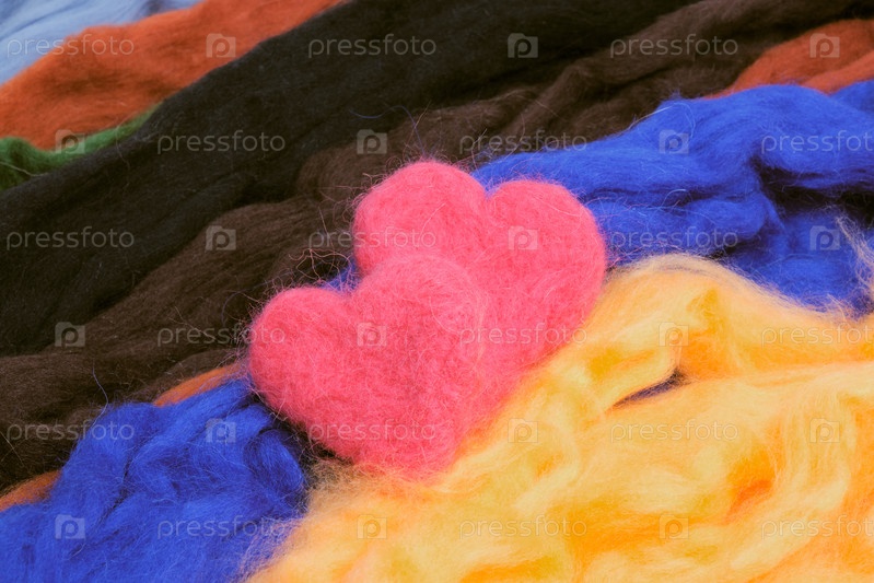 Два шерстяных сердца на фоне из шерстяного валяния в виде линий