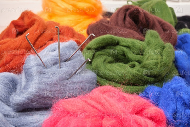 Несколько мотков окрашенной натуральной овечьей шерсти для валяния на столе
