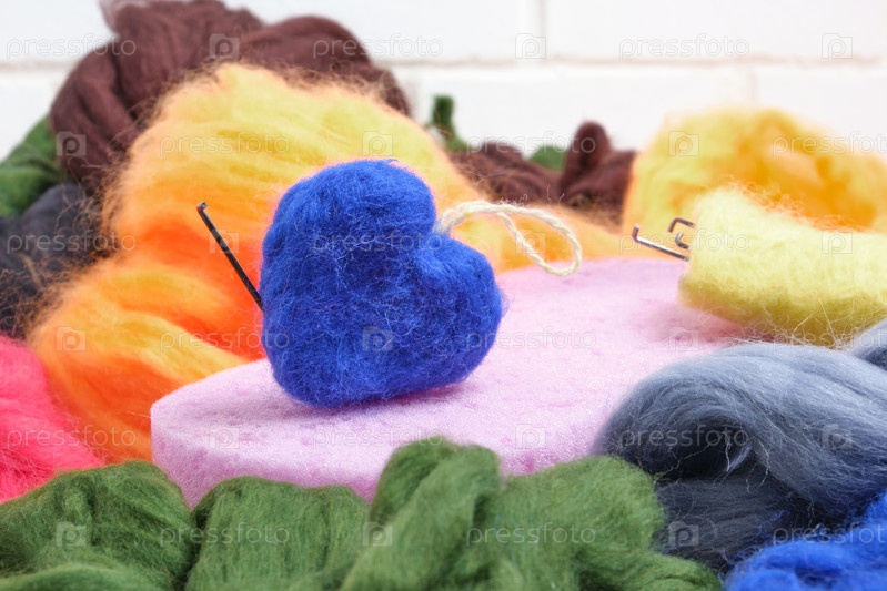 Процесс валяния сердца из синей шерсти, иглы для валяния, губка и шерсть на столе, романтический подарок ручной работы