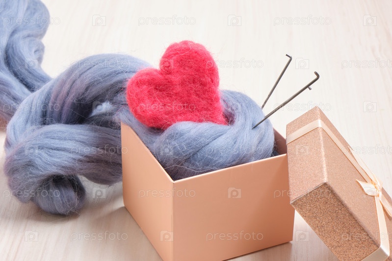 Розовое валяное шерстяное сердце из иголки и моток шерсти в подарочной коробке на столе