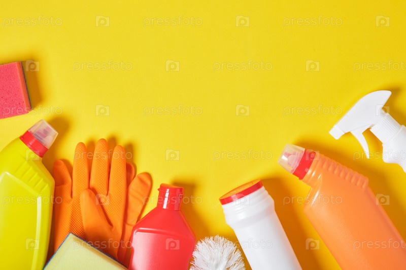 Различные моющие средства для чистки на желтом фоне копируют вид сверху,