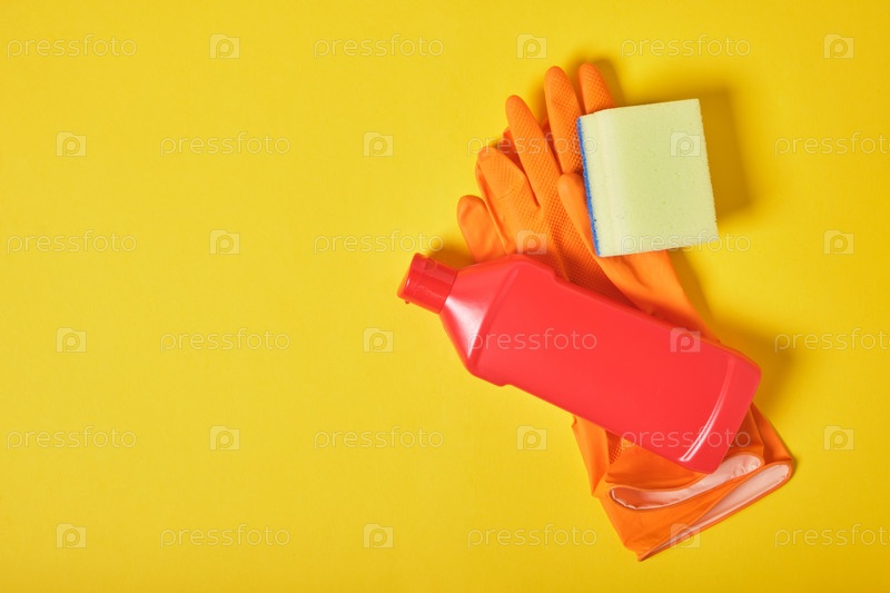 Желтая губка, резиновая перчатка и бутылка с моющим средством на желтом фоне