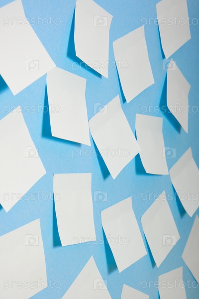 Много светло-голубых бумажных наклеек на синем фоне, узор наклеек для заметок, макет