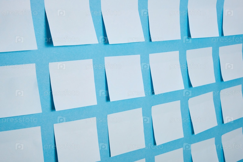Много светло-голубых бумажных наклеек на синем фоне, рисунок наклеек для заметок, макет, выборочный фокус