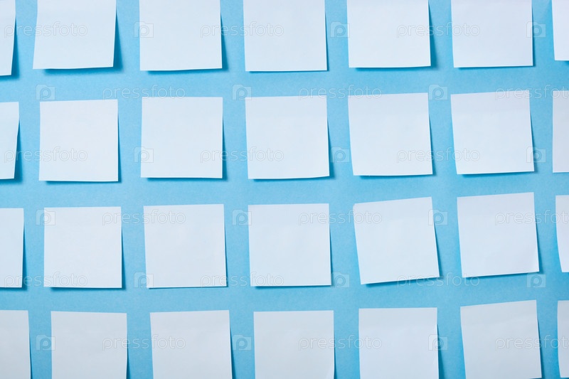 Много светло-голубых бумажных наклеек на синем фоне, рисунок наклеек для заметок, макет, пространство для копирования