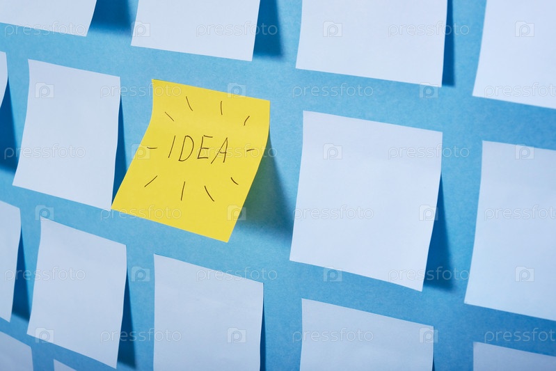 Одна желтая наклейка с идеей надписи среди набора голубых бумажных наклеек на синем фоне, шаблон наклеек для заметок