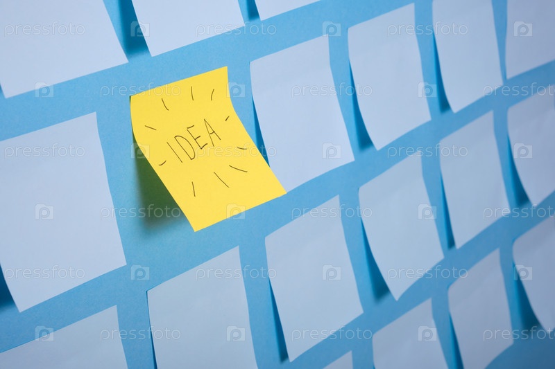 Много светло-голубых заметок и одна желтая наклейка со словами идея, синий фон, концепция мозгового штурма