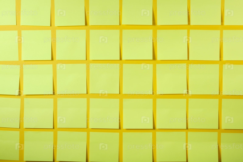 Много светло-желтых наклеек для заметок на желтом фоне, концепция мозгового штурма