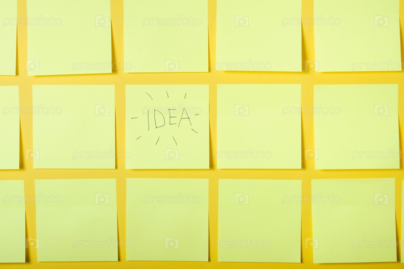 Много светло-желтых заметок на желтом фоне, одна наклейка со словами идея, концепция мозгового штурма
