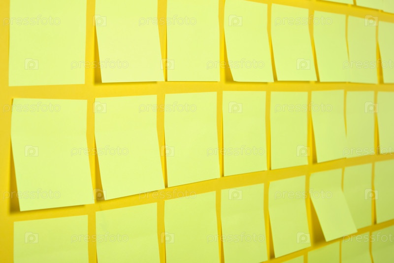 Много светло-желтых наклеек для заметок на желтом фоне, концепция мозгового штурма