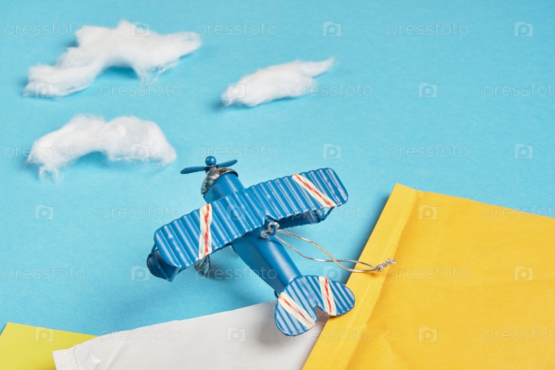 Игрушечная модель винтажного самолета из металла и несколько посылок на синем фоне, облака ваты, концепция авиапочты, вид сверху