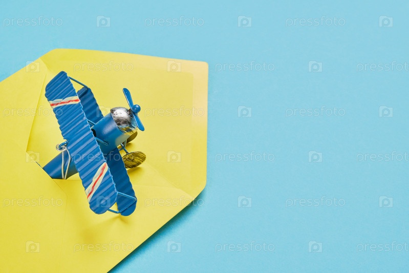 Модель винтажного металлического самолета и желтый концерт на синем фоне, концепция авиапочты, отправка почты на большие расстояния