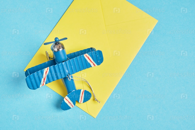 Модель винтажного металлического самолета и желтый концерт на синем фоне, концепция авиапочты, отправка почты на большие расстояния