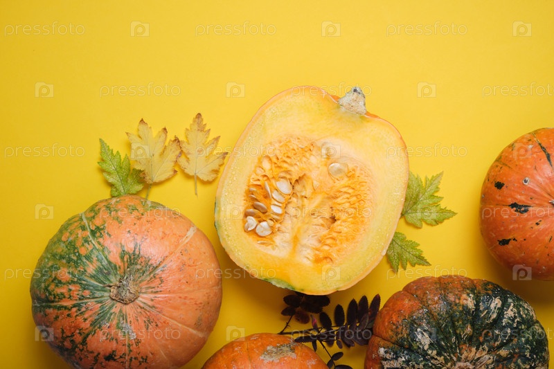 Свежая тыква на желтом фоне, разрезанная пополам тыква и несколько необычных тыкв на желтых осенних листьях