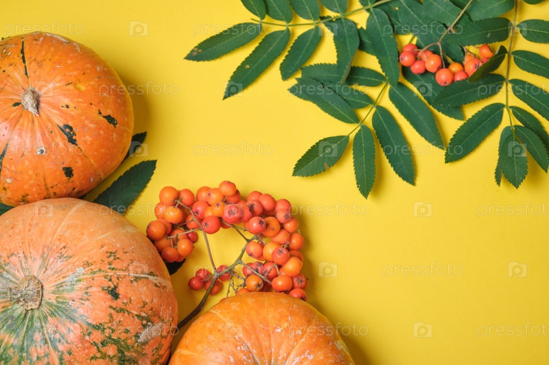 Ветка рябины с зелеными листьями и несколько разных тыкв на желтом фоне