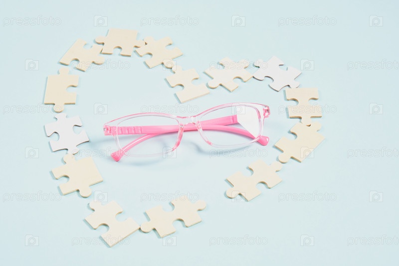 Детские розовые очки и сердце из деревянных пазлов на голубом фоне, очки для маленьких детей