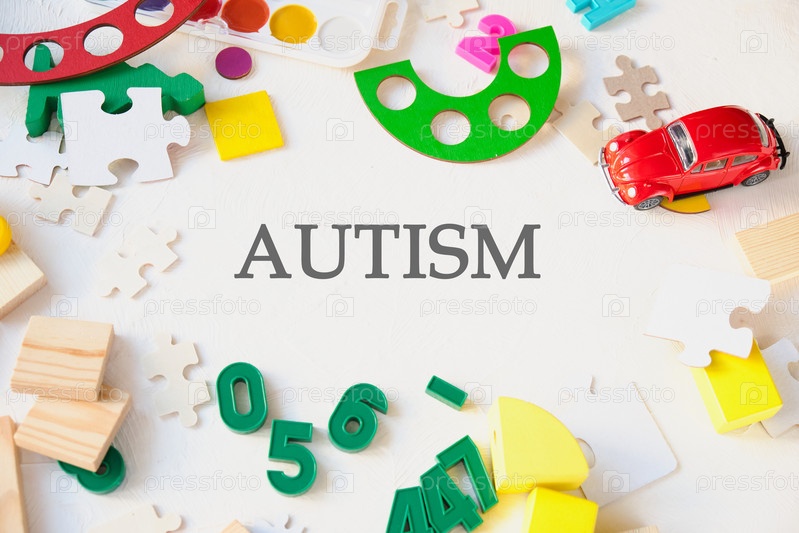 Слово аутизм и развивающие игрушки на светлом фоне, концепция Всемирного дня осведомленности об аутизме, развитие детей с аутизмом