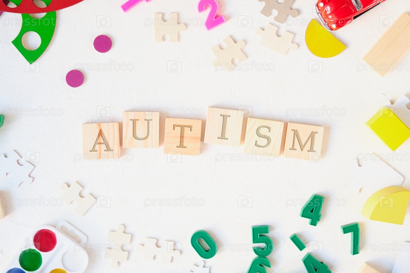 Слово аутизм на деревянных квадратах на светлом фоне, детские развивающие игрушки, всемирный день осведомленности об аутизме, месяц аутизма