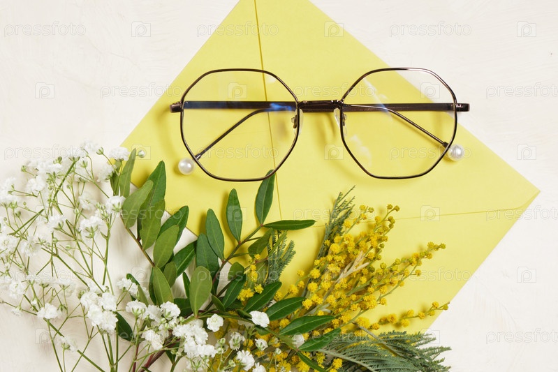 Модные современные очки и букет весенних цветов в конверте на бежевом светлом фоне копируют пространство, концепцию летнего и весеннего настроения