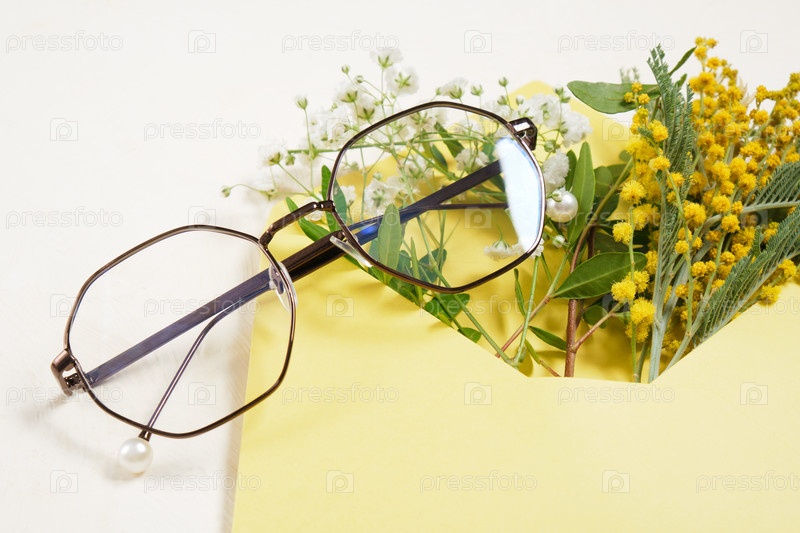 Модные современные очки и букет весенних цветов в конверте на бежевом светлом фоне копируют пространство, концепцию летнего и весеннего настроения