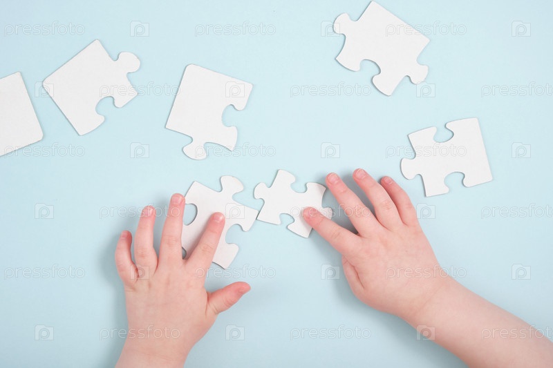Детские руки держат головоломки на синем фоне