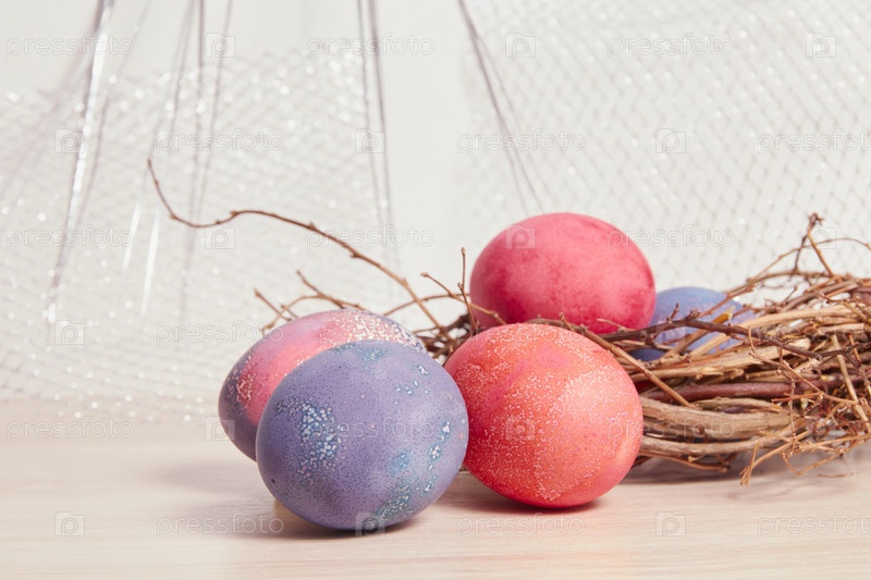 Расписные пасхальные яйца и декоративное гнездо из веток на деревянном столе