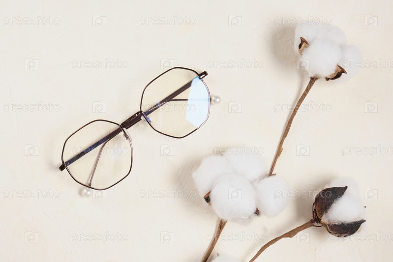 Очки и хлопковые цветы на бежевом фоне