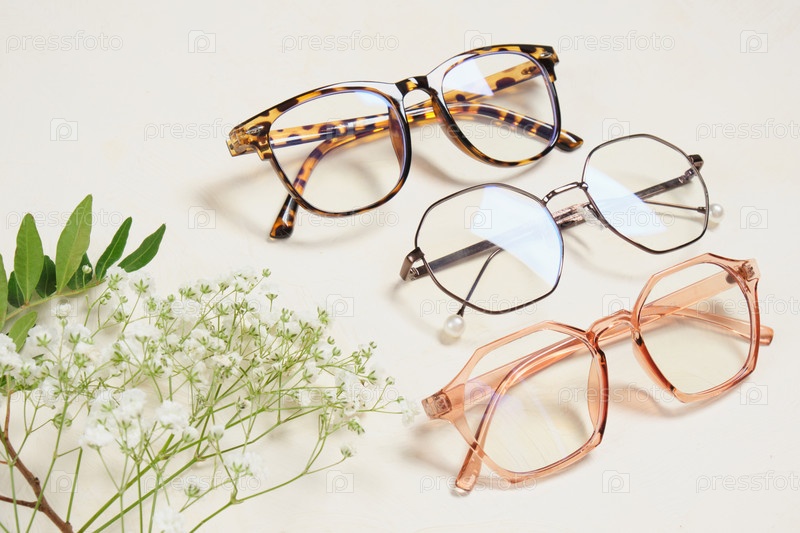 Несколько модных очков и цветов на бежевом фоне копируют пространство вид сверху