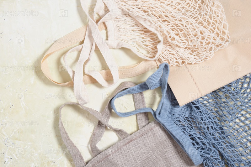 Экологически чистые сумки на светлом фоне, покупатели натуральных материалов, экологически чистый образ жизни, концепция нулевых отходов
