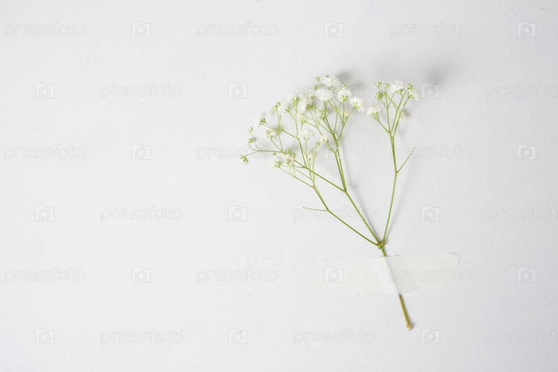 Гипсофила, склеенная бумажной лентой на сером фоне, концепция весеннего настроения