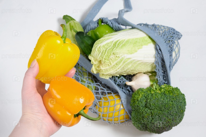 Свежие овощи в экологически чистой многоразовой хозяйственной сумке Покупки продуктов с эко-сумкой. Концепция устойчивого и экологически чистого образа жизни