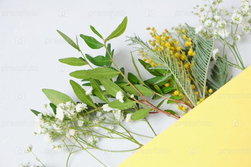Цветы на сером и желтом фоне, цвета 2021 года, копия пространства, концепция весеннего настроения, мимоза на сером фоне
