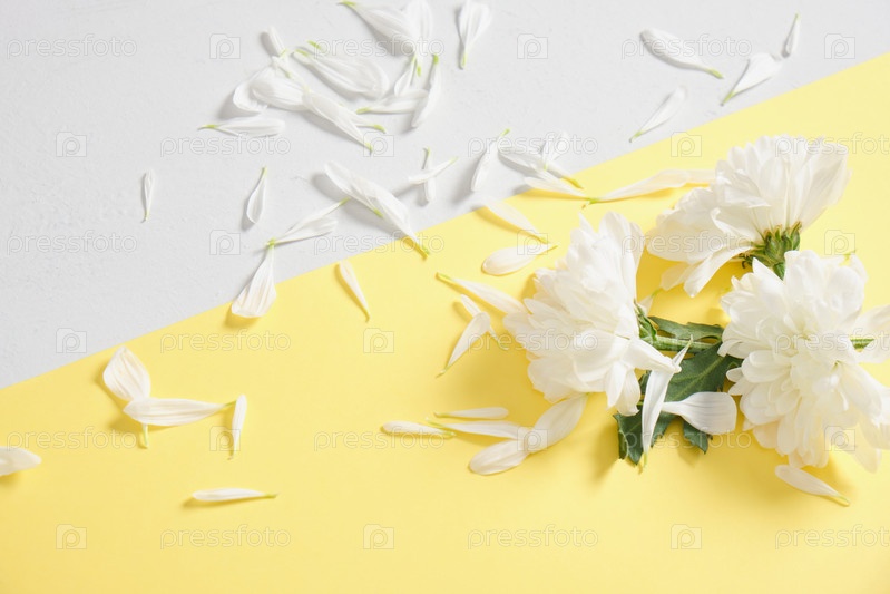 Белая хризантема на сером и желтом фоне, цвета 2021 года, концепция весеннего настроения